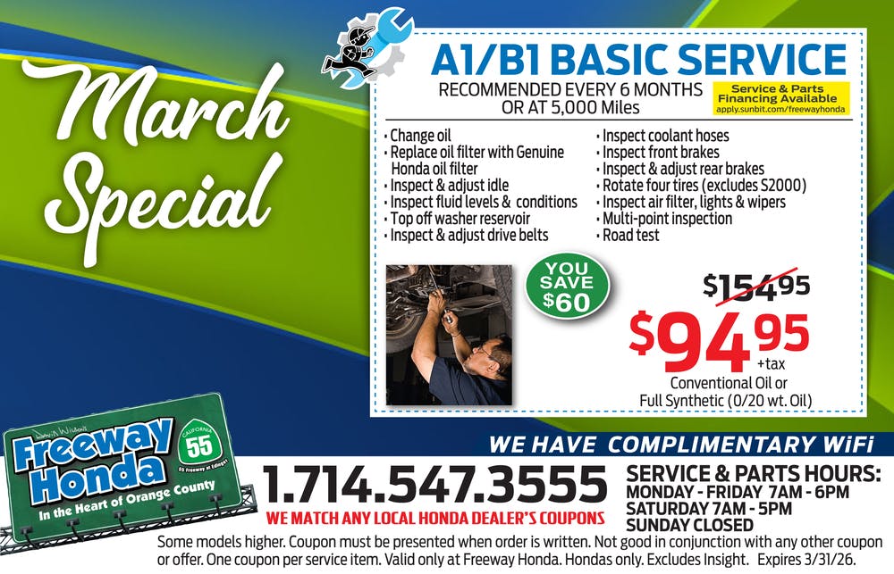 Over-the-counter only. Some restrictions apply. Coupon must be presented when order is written. Not good in conjunction with any other coupon or offer. One coupon per service item. Valid only at Freeway Honda. Hondas only.
