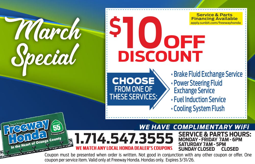 Over-the-counter only. Some restrictions apply. Coupon must be presented when order is written. Not good in conjunction with any other coupon or offer. One coupon per service item. Valid only at Freeway Honda. Hondas only.