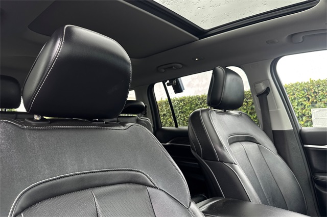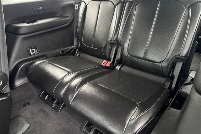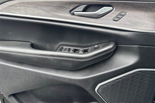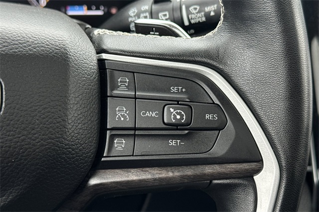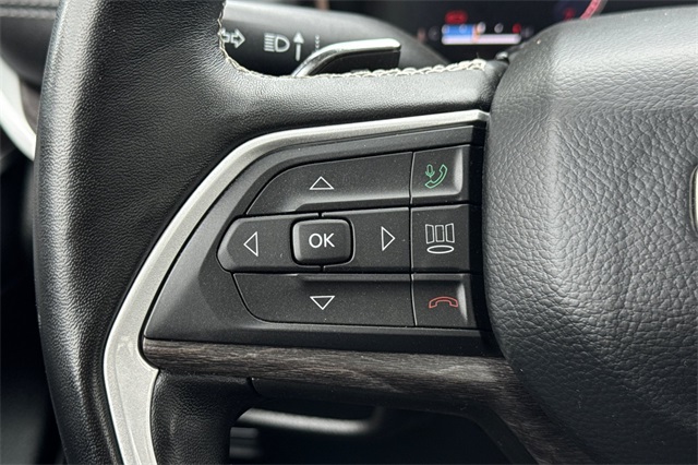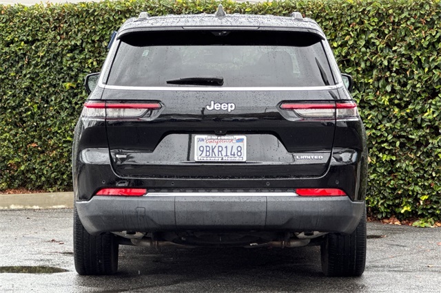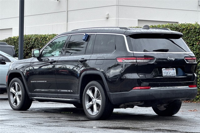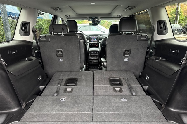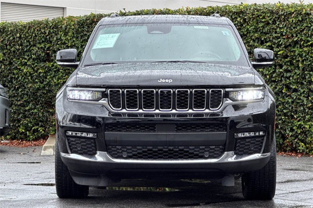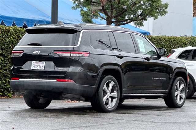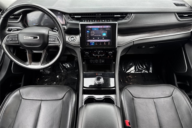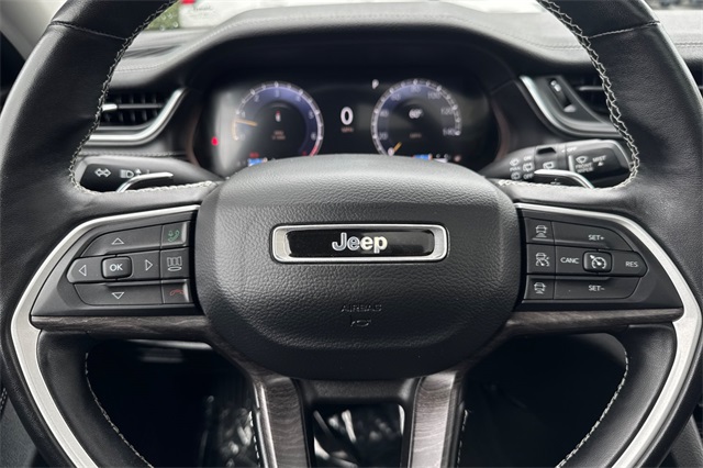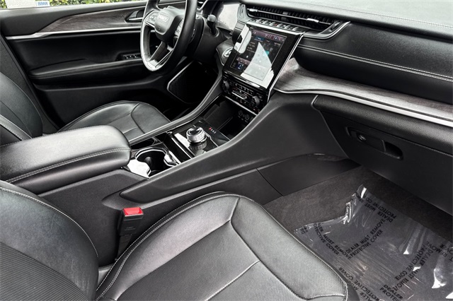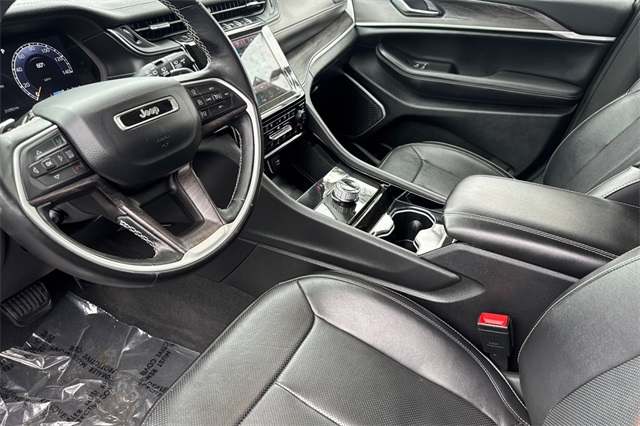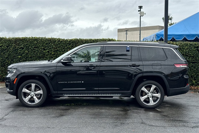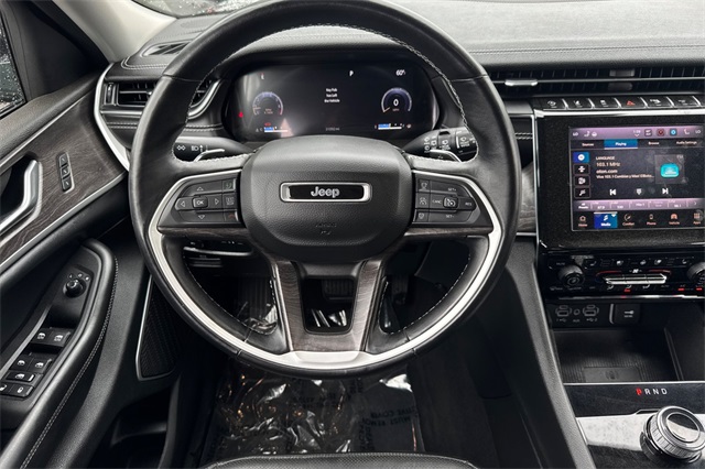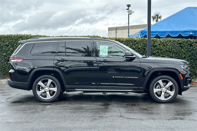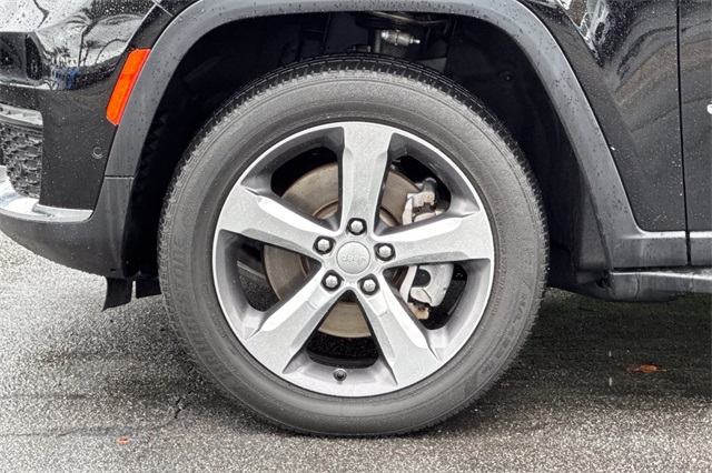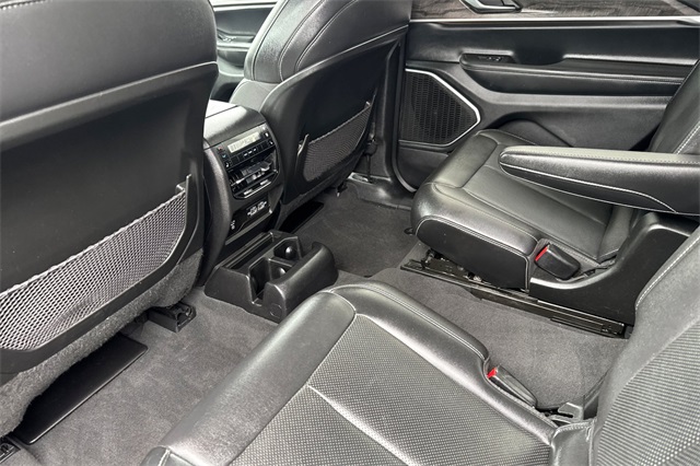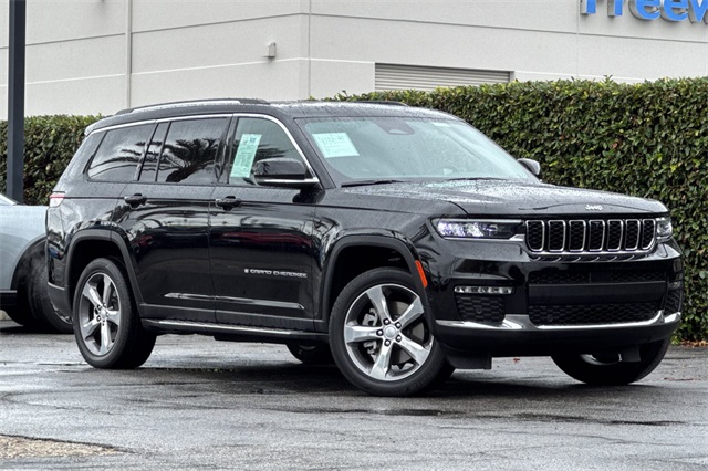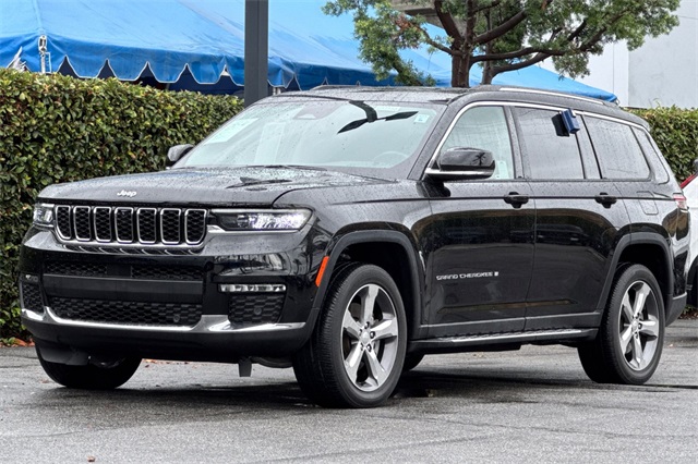 Diamond Black Crystal Pearlcoat 2022 Jeep Grand Cherokee L Limited. It's powered by a 3.6L V6. This has 3 rows of seating and being the Limited model it's loaded with features like heated, vented, and powered Capri-leather trimmed seats, even the steering wheel & 2nd row seats are heated. There's woodgrain trim, a dual pane panoramic moonroof, a 10.25" touch screen audio system with a built in Wi-Fi hotspot, premium speakers, wireless phone charger, an auto-dimming mirror with universal garage opener, a power tilt & telescopic steering column, even a power tailgate. There are running boards, alloy wheels, the tow prep package includes a conventional spare tire, load levelling rear suspension, Safety features include blind spot monitors in the heated mirrors, parking assist, forward collision warning & braking, lane keeping assist, rain-sensing wipers, and all around camera, and more.