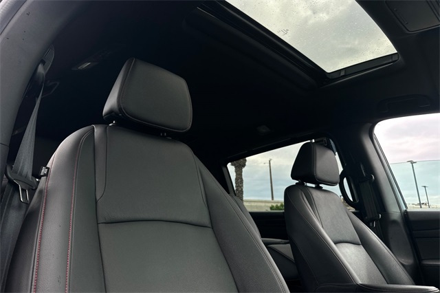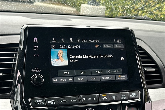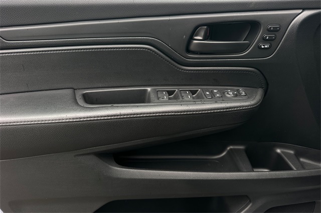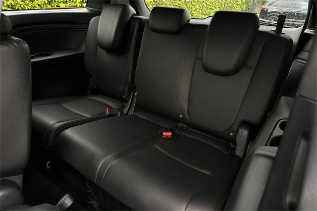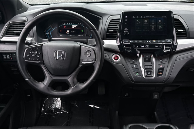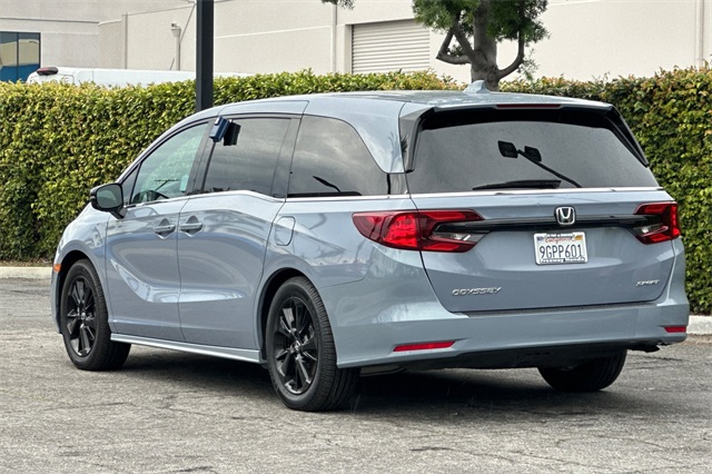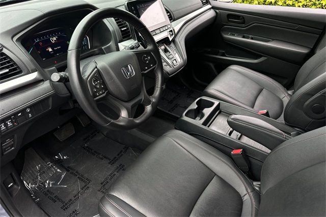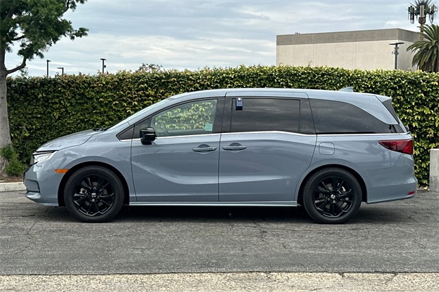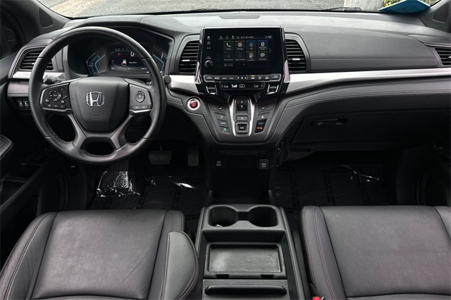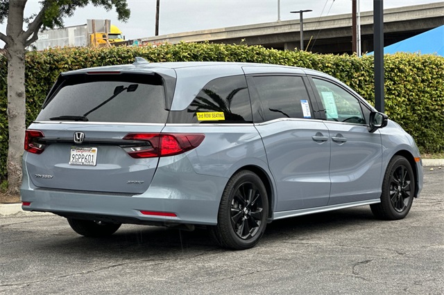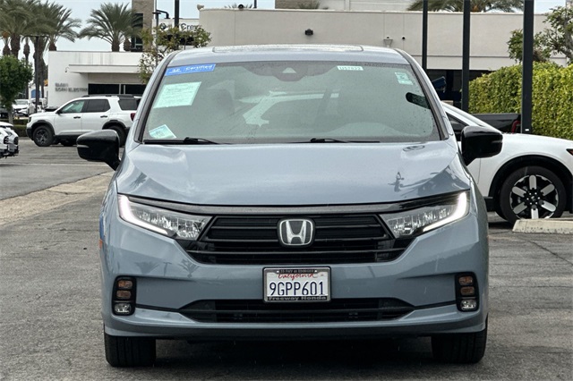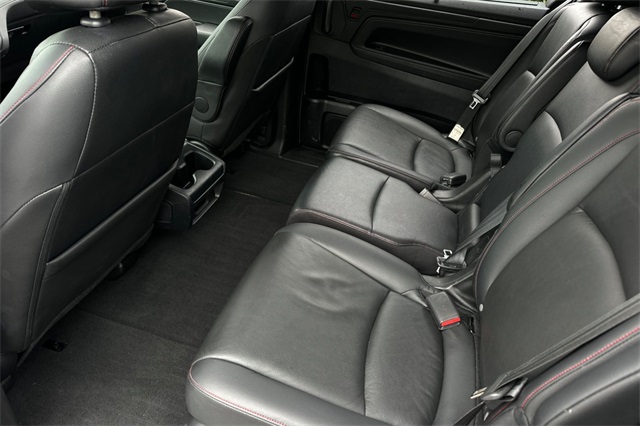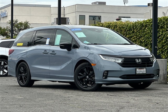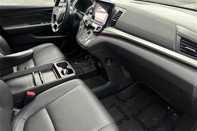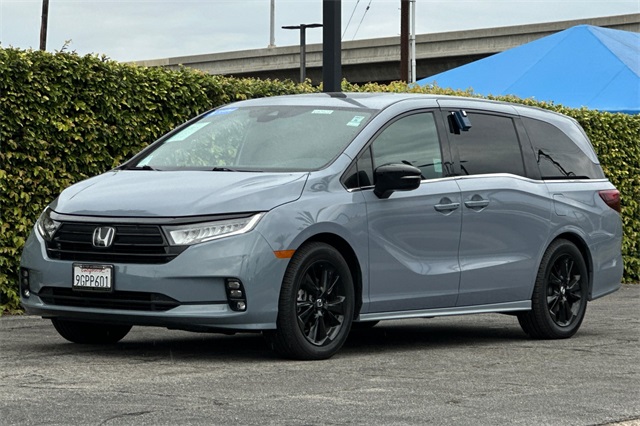 Certified. 2023 Honda Odyssey Sport. It's powered by a 3.5L i-VTEC V6 SOHC with a 10-Speed Automatic. It's Sonic Gray Pearl outside with all gloss Black trim, including the 19" alloy wheels. The seats are trimmed in Black leather with Red accent stitching, they're heated and powered front seats, the driver's side also has a two position memory. This "mini"-van is great for your family with seating for up to 8 people. The 3rd row seat will fold into the rear floor area and the 2nd row has a removable center seat. It's equipped with safety features like the blind spot info system, adaptive cruise control, lane keeping assist, forward collision warning & braking, a 3-view backup camera with rear cross traffic alert, side curtain airbags for all three rows, and much more. It has conveniences like 3-zone automatic climate control, Apple Carplay and Android Auto capability, dark privacy glass and remote starting for hot days, LED interior accent lighting, 900 cupholders (I'm joking, there are 15), and so much more.