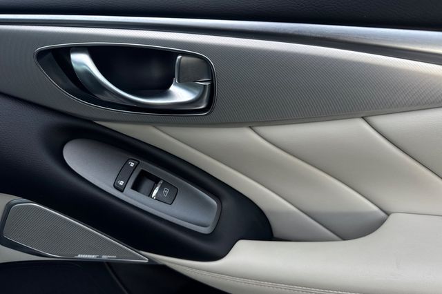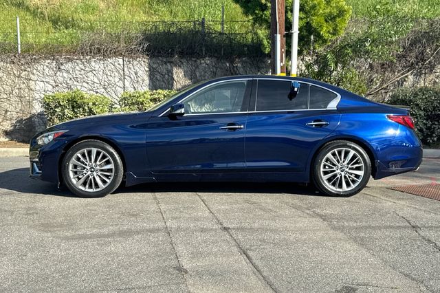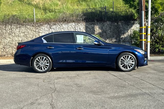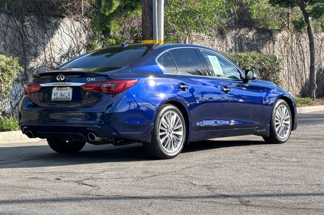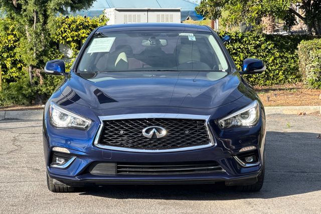 2023 INFINITI Q50 Luxe. It's powered by the 300HP 3.0L twin-turbo V6 engine with rear-wheel drive. It's Grand Blue Metallic outside with Stone Leather seating inside. The front buckets are 8-way power adjustable with driver memory settings. There's dual-zone automatic climate control, heated front seats, and a tilt/telescoping steering wheel. The BOSE Premium audio system features 16 speakers with Apple CarPlay/Android Auto, SiriusXM satellite radio. Safety tech includes adaptive cruise control, forward collision warning with automatic emergency braking, blind spot monitoring, and backup camera. Additional features include push-button start, remote engine start, auto-dimming rearview mirror with universal garage opener, and LED headlights. With only 20,957 miles and priced at $33,988, this low-mileage luxury sedan delivers impressive fuel economy. Contact Freeway Honda to schedule your test drive.