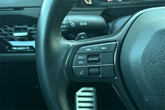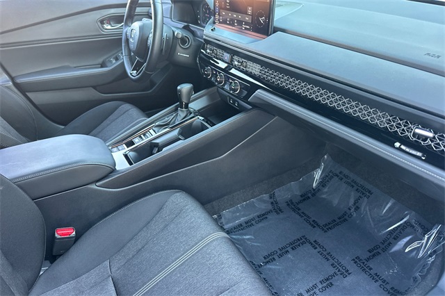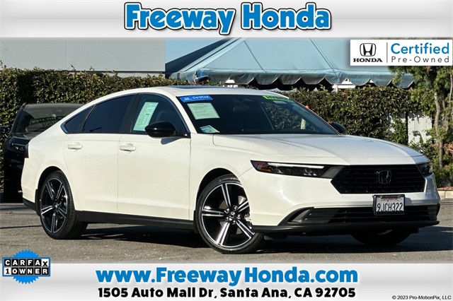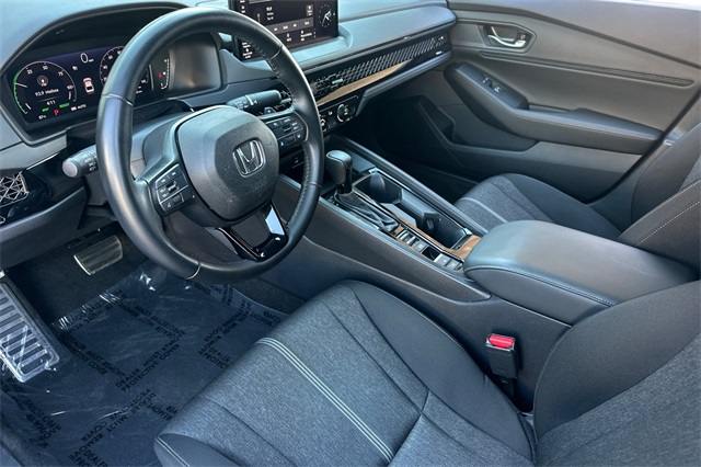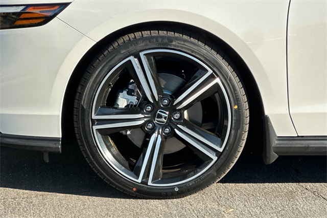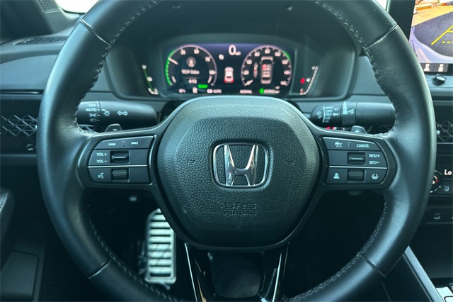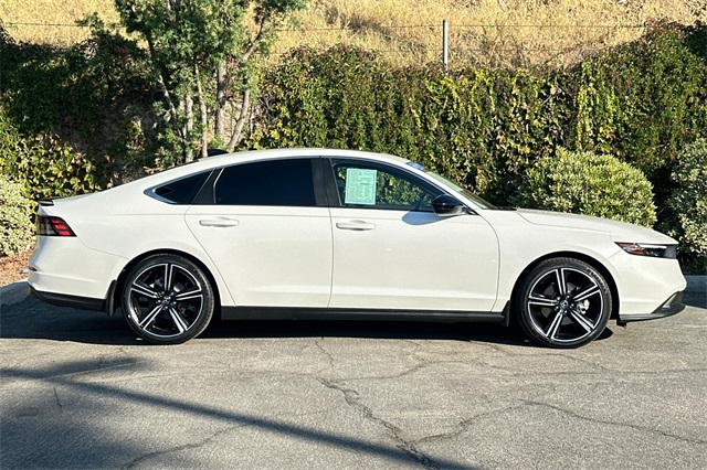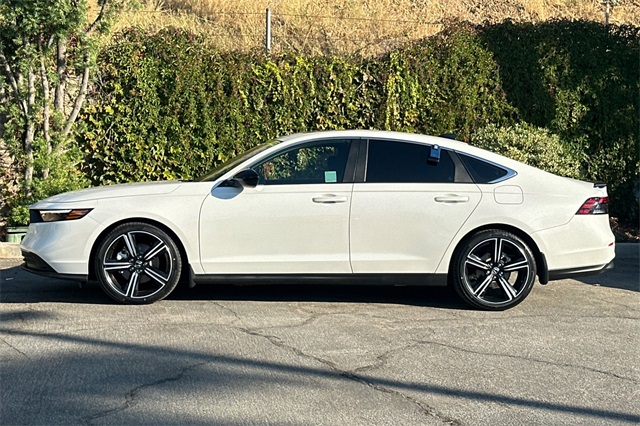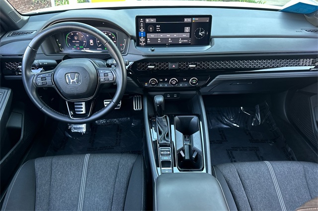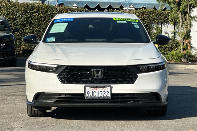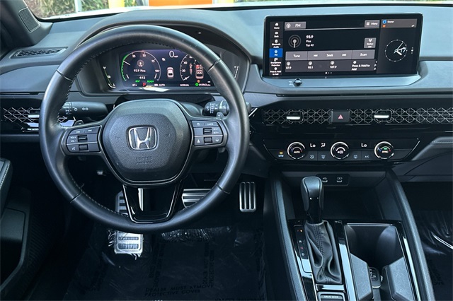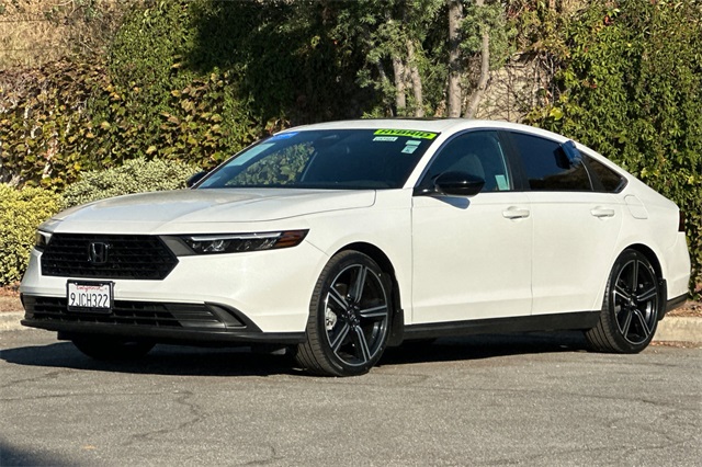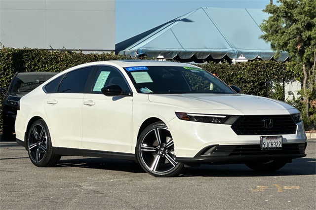 Certified. 2024 Honda Accord Hybrid Sport. This one is powered by two electric motors plus a 2.0 DOHC 16V ICE engine. You end up with strong smooth power, great traction and fuel economy. It's Platinum White Pearl and inside it has Black interior trim. Features include 19"alloy wheels, LED lighting for great night time visibility, a rear spoiler, and power moonroof. The seat adjustment is powered for the driver. The 8-speaker 180W audio system has a color touch screen, with wireless Apple Carplay/Android Auto capability and Alexa built-in. There are blind spot alerts in the heated outside mirrors, adaptive cruise control with stop & go, forward collision warning & braking, lane keeping assist, a 3-view backup camera rear cross traffic alert plus dual zone climate control, and split/fold down rear seat back for extra carrying capability.