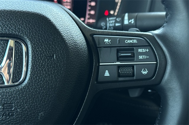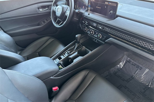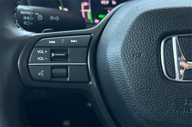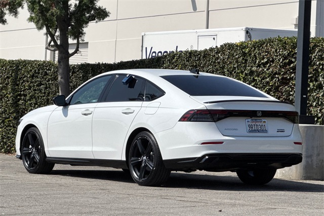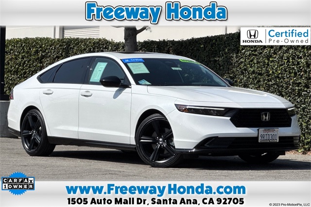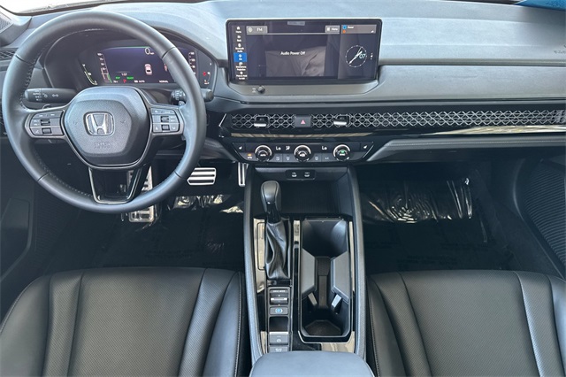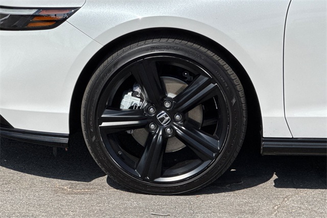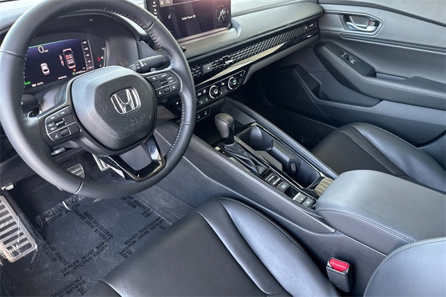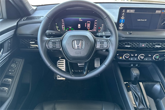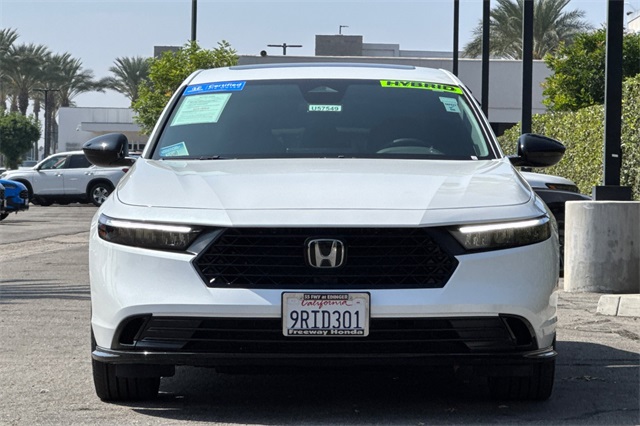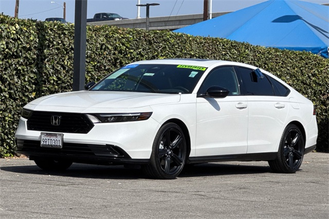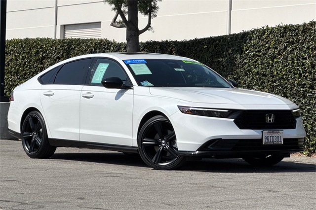 Certified. 2024 Honda Accord Hybrid Sport-L This one is powered by two electric motors plus a 2.0 DOHC 16V ICE engine. You end up with strong smooth power, great traction and fuel economy. It's Platinum White Pearl and inside it has Black leather interior trim. Features include 19"alloy wheels, LED lighting for great night time visibility, a rear spoiler, and power moonroof. The heated front seats are powered with a memory for the driver's side. The 8-speaker 180W audio system has a color touch screen, with wireless Apple Carplay/Android Auto capability and Alexa built-in. There are blind spot alerts in the heated outside mirrors, adaptive cruise control with stop & go, forward collision warning & braking, lane keeping assist, a 3-view backup camera