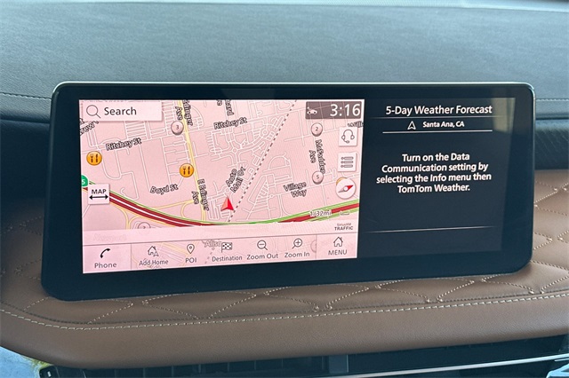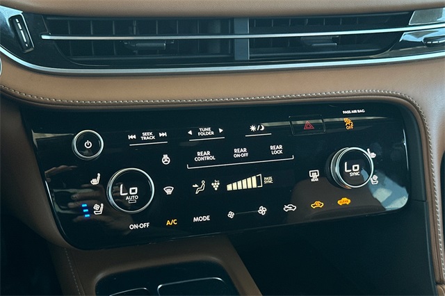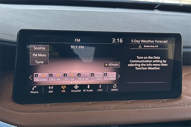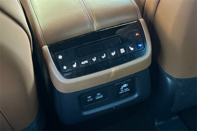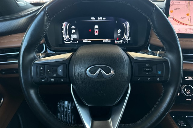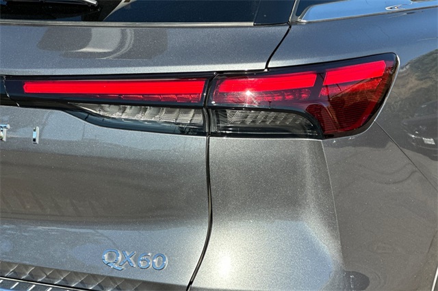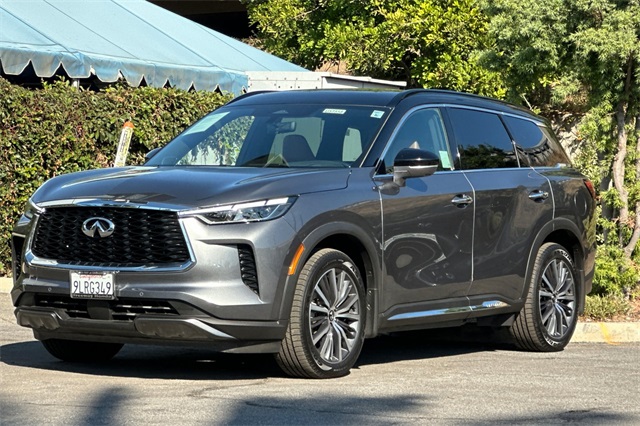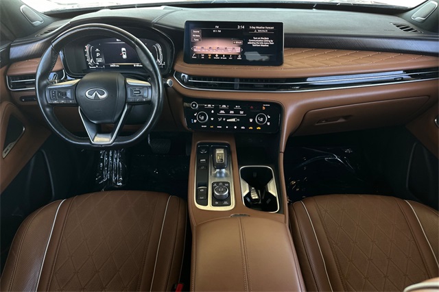 2024 INFINITI QX60 Autograph with All-Wheel-Drive. Motoring in the lap of luxury, this is the top of the line model in Graphite Shadow with a Black Obsidian colored roof and a saddle brown interior that's equipped with a 17 speaker BOSE Performance premium audio system with wireless Apple Carplay/Android Auto/navigation with traffic info and a built in Wi-Fi hotspot. There's a 12.3" interactive display with head-up instrumentation to help you keep your eyes on the road. The quilted quad captain's chairs are trimmed in semi aniline leather. The front seats have massagers, heating, and cooling. Even the 2nd row seats are heated, as is the steering wheel. Woodgrain trim, illuminated door sills, and a 2nd row console adds to the opulence. There's a power panoramic moonroof with power sunshade, an around view monitor, auto-dimming mirrors with garage opener, front & rear parking sensors. It's equipped with a 6,000lb towing package that includes trailer sway control, a tow hitch receiver, trailer pre-wiring and a transmission cooler and auto-leveling adaptive LED lighting. There are blind spot monitors, rear cross traffic alert, and more.