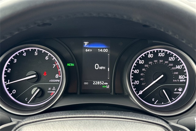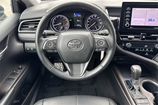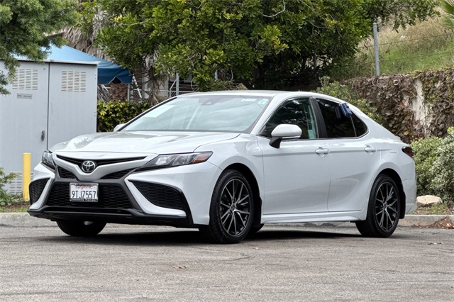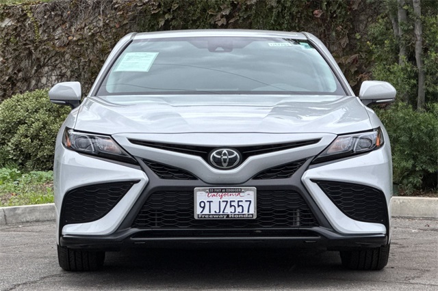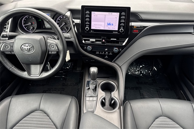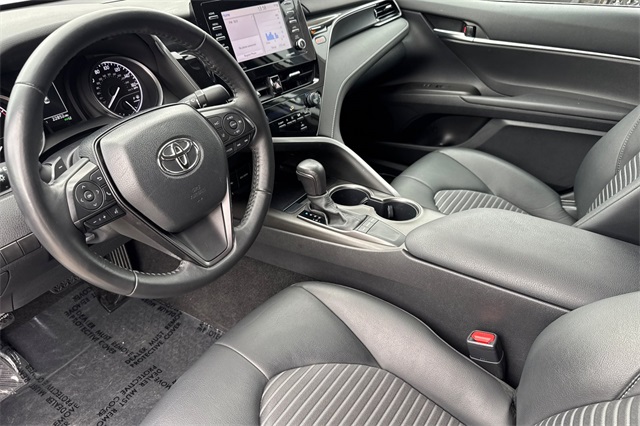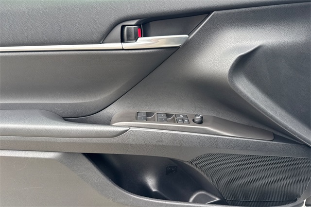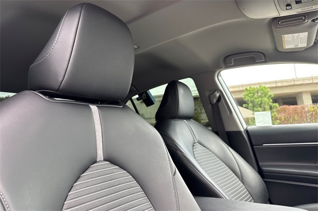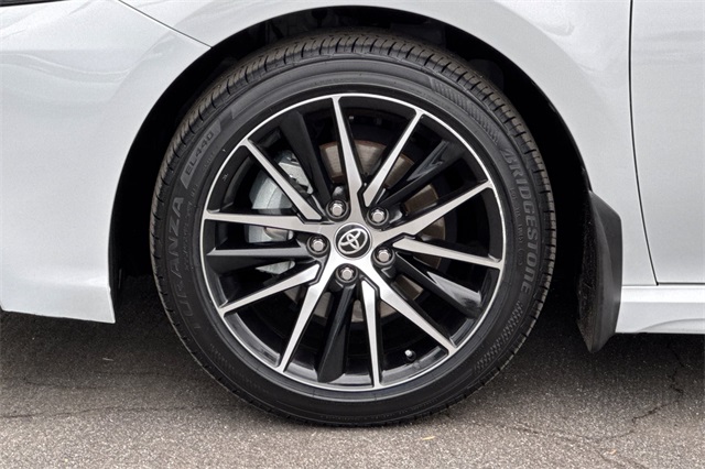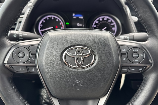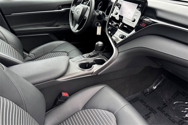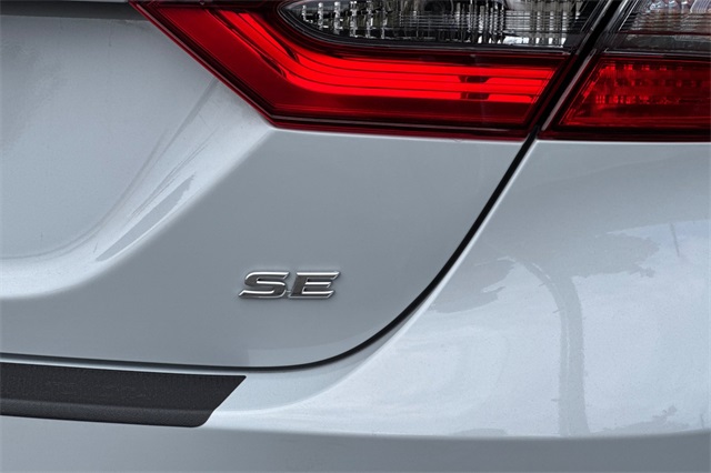 2024 Toyota Camry SE. It's powered by a 203HP DOHC 2.5L engine. It's Ice Edge outside with sport seats in Black SofTex seat trim with fabric inserts. Outside it's got 18" alloy wheels, LED headlamps, a rear spoiler and lower body skirts. Inside is a power driver's seat, a split folding rear seat back, dual zone climate control, a touch screen audio system with Apple Carplay & Android Auto capability plus a backup camera. Safety features include 10 airbags, Dynamic Radar cruise control that helps keep you a safe distance from the car in front of you, lane departure alert with lane tracing assist, forward collision warning & braking with pedestrian detection, ABS brakes with Brake Assist, and more.