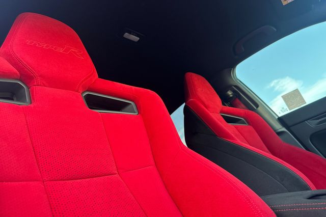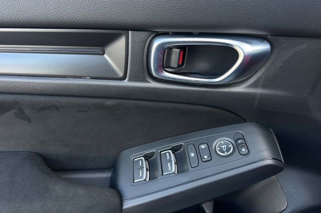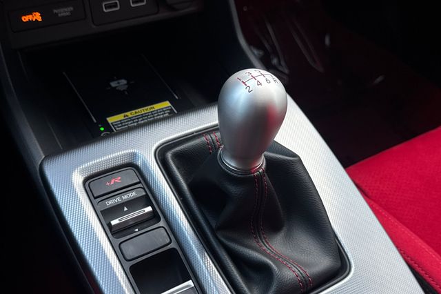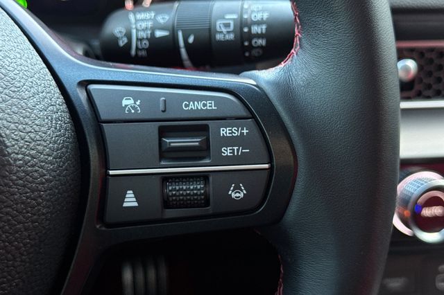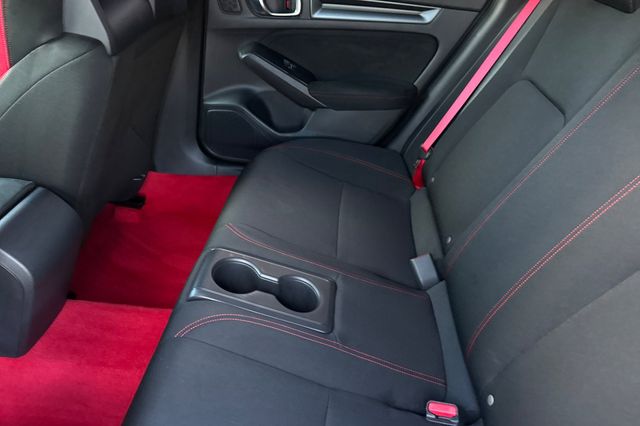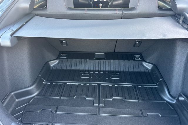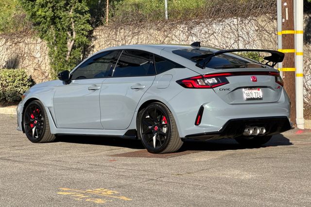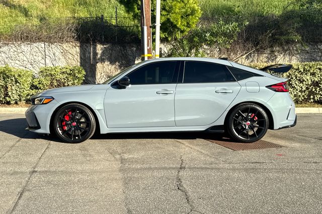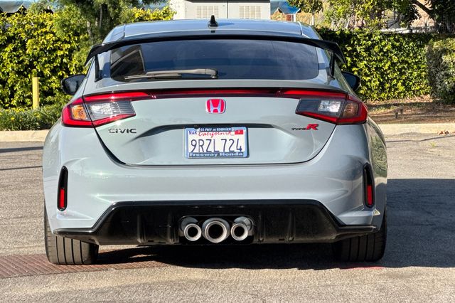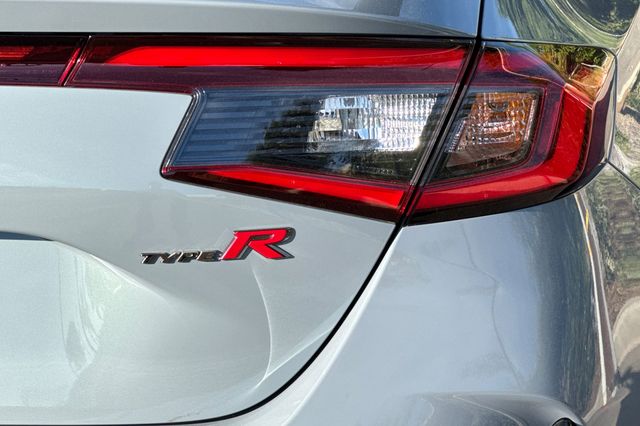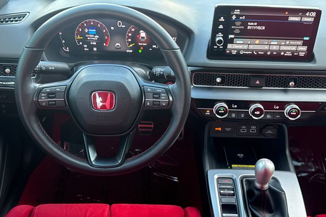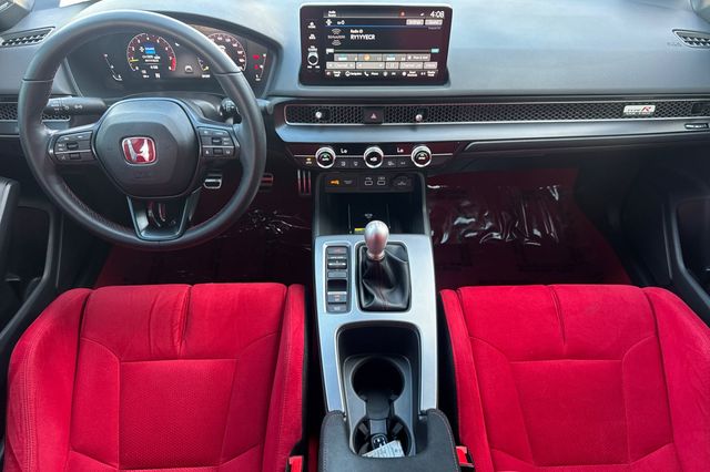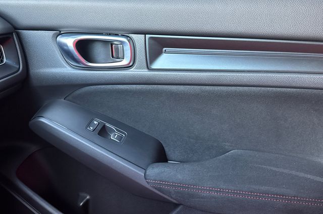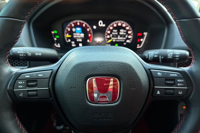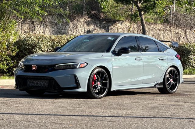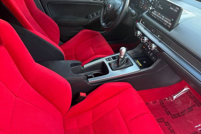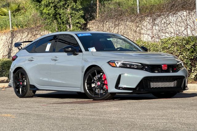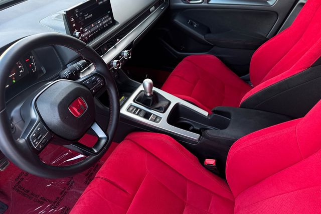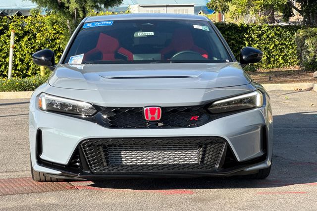 Certified. 2025 Honda Civic Type R. It's powered by the turbocharged 315HP 2.0L 4-cylinder with 6-speed manual transmission and a limited slip differential. It's Sonic Gray Pearl outside with Black/Red Suede effect sport seats on the inside. This high-performance hatchback has only 6,287 miles and features adaptive cruise control, forward collision warning, lane departure warning, and blind spot monitoring with backup camera. The Type R includes 19" alloy wheels, grippy performance tires, Brembo brakes, adaptive dampers, and launch control. There's a 12-speaker Bose premium audio system, wireless phone charging, dual-zone automatic climate control, and Honda SENSING safety suite. The aggressive aerodynamics package includes front splitter, side skirts, rear wing spoiler, and center-mounted triple exhaust. Red accents throughout the cabin match the bucket seats. Priced at $49,988. Contact Freeway Honda to schedule your test drive.