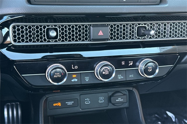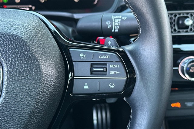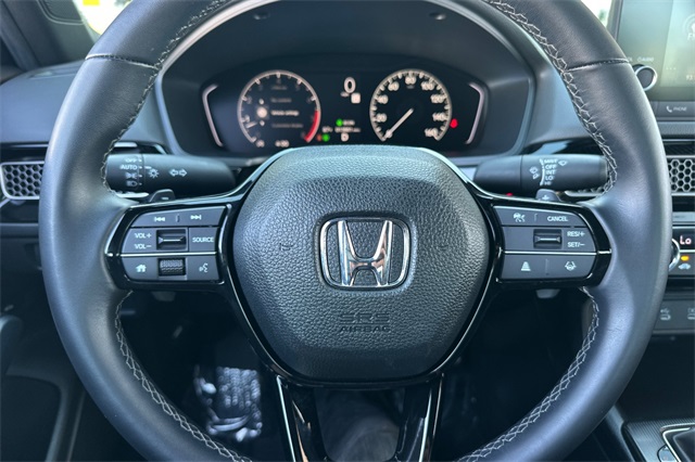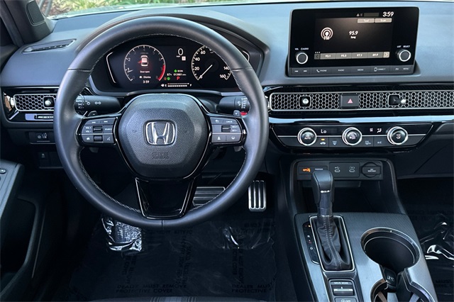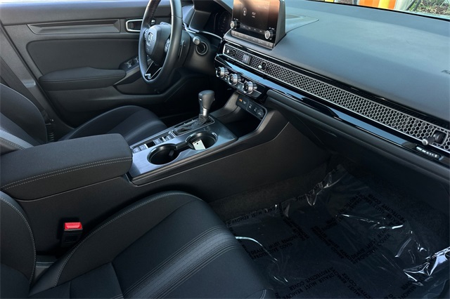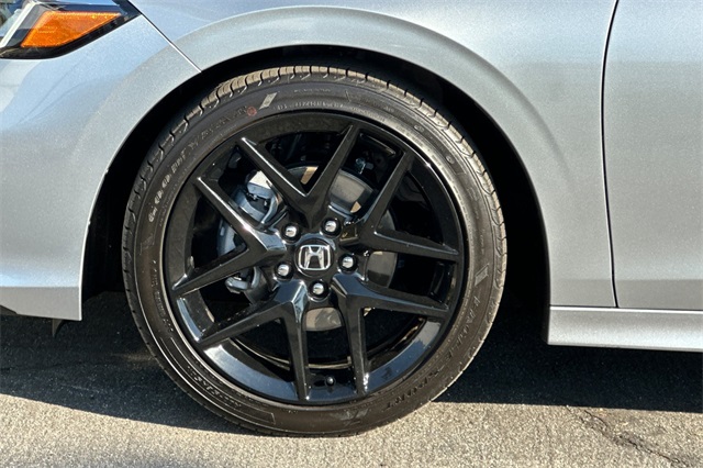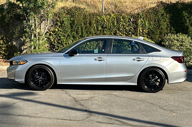 Certified. Solar Silver Metallic 2025 Honda Civic Sport Sedan. A one owner locally owned and serviced car powered by a 2.0L i-VTEC engine and an automatic transmission with paddle shifters on it's leather wrapped steering wheel. It's got Black cloth trim, an 8-speaker audio system with Apple Carplay and Android Auto capability, adaptive cruise control, lane keeping assist, forward collision warning & braking, 18" black alloy wheels, heated mirrors with blind spot monitors, LED headlights, remote starting, a 3-view backup camera with cross traffic alert, a fold down rear seatback, and more.